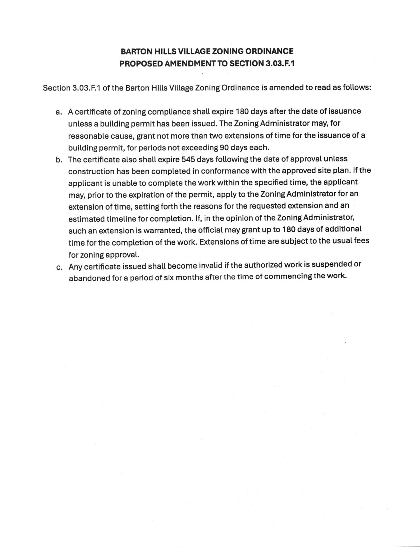 At their September 9, 2025 meeting, the BHV Planning Commission voted to amend Zoning Ordinance Section 3.03 F1 Expiration and Revocation, to permit extensions of Zoning Certificate approvals. The Commission will hold a public hearing on the amendment at its December 9, 2025 regular meeting. The proposed Zoning amendment can be reviewed, and a copy obtained at the BHV Clerk’s office in the Village Hall. Residents may comment on the proposed Zoning amendment: